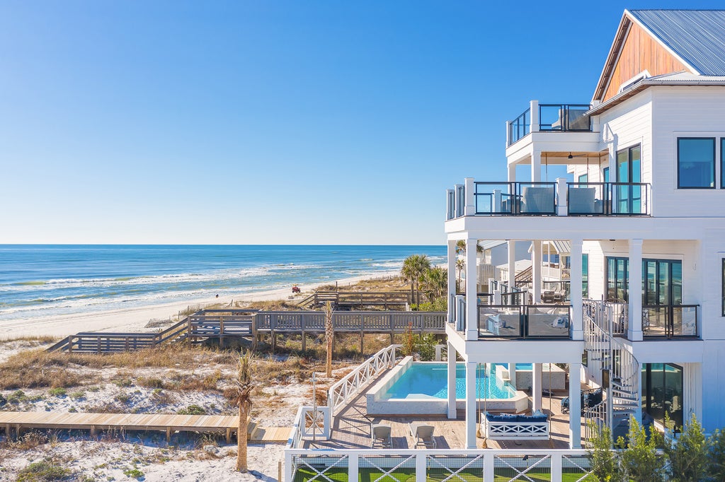 This Barbie Dreamhouse of a villa features a whopping 24 beds, with expansive terraces on every floor that opens up to the stunning Emerald Coast. We can’t imagine a more fabulous setting for a big gathering, thanks to a spacious outdoor pool, wet bars, movie theatres, and a private beach boardwalk. It’s a short hop away from Rosemary Beach, known for its pristine sands and turquoise waters.