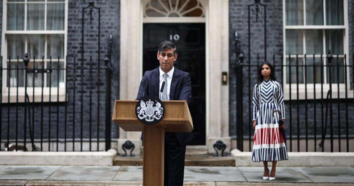 Following the Conservative party’s historic defeat, Rishi Sunak made a final speech outside 10 Downing Street, with his wife Akshata Murty standing behind him.