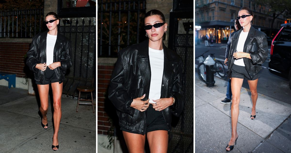 Spotted in New York’s West Village, Hailey styled a cropped white T-shirt and micro shorts with what has become the transeasonal coverup of choice by stylish women everywhere — the leather bomber jacket.