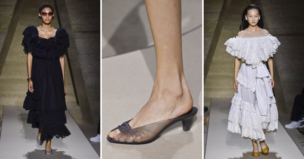 This makes sense, spring temperatures naturally induce whimsy, after all. Following on from Chloé’s cult jelly shoe last year, it’s latest style isn’t just whimsical, however, it’s practically Disney-themed. Shaped like a glass slipper and made of jelly, it’s a peep-toe mule that’s princess-y to a fault (some might argue). On the catwalk, they were styled with summer dresses so pretty with their cut-work cotton fabrication, so ruffled in fact, that onlookers couldn’t help but get swept up in the romance of it all (even while contemplating what kind of blisters might form around that peep toe and whether the appropriate plasters are sold by Compeed). But would they really translate in real life? If you’re a grown-up?