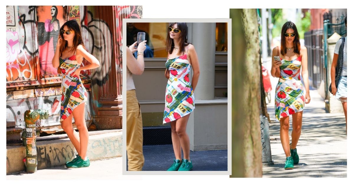 Stepping out in New York earlier this week, Emily Ratajkowski wore an asymmetrical mini dress from celebrity favourite Miaou. Riffing off retro postcards, the ‘Helga’ dress is splattered with saucy vegetables (or is it a fruit?) and grocery cart motifs. It hangs from 90s-style pin-thin straps and falls to a cowl neckline.