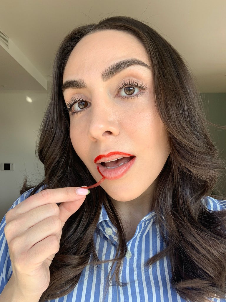 “Peeling it off was quick and totally painless, but the pigment clung to my dry patches, creating an uneven finish. I’m not a red lip person, so I might not be the best judge of the shade, but once I added a bit of lip oil, it evened out and looked much better! As a habitual lip licker (and picker), it didn’t last very long on me — just smushing my lips together and eating breakfast was enough to wear most of it, so I ended up removing the rest with a little micellar water on a cotton bud. It’s safe to say, it won’t be replacing my trusty Laura Mercier Perfecting Lip Liner anytime soon, but it is pretty fun.”