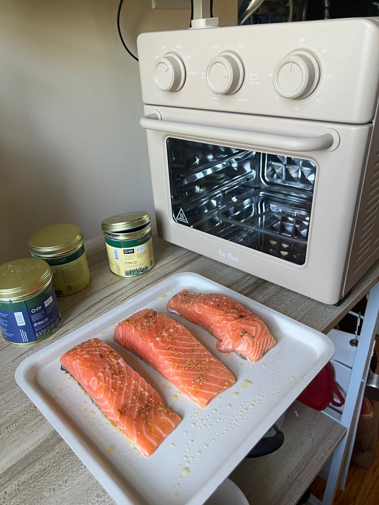As a victim of my home oven’s uneven heat distribution as well as my unsatisfactory cooking skills, this beginner-friendly invention sounded too good to be true — albeit a dream. How can something so cute claim to crisp whole chickens, sizzle salmon fillets, bake bread, and more? So, I did what any lifestyle shopping writer would do. I reached out to Our Place, plugged in the Wonder Oven, and put it to the test the second I finished reading the manual. Read on to see how well this brave little toaster handled a full-fledged salmon dinner all from the comfort of my kitchenette’s countertop.