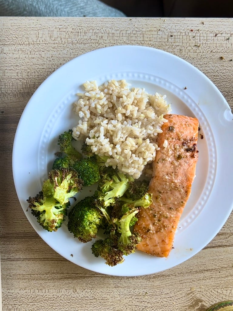 Onto the main event: salmon. I followed Our Place’s Gochujang Salmon instructions rather than the recipe (did not have those ingredients). I olive-oiled up three pieces of BBQ-cut filets and sprinkled on seasonings while I preheated the oven to 400 degrees on the broil setting.