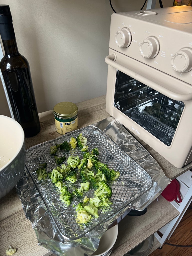 For the third, final, and highly anticipated installment, I air-fried some veggies. To my knowledge, people invest in air fryers specifically to avoid their ovens, so I was eager to see how Our Place pulled this off. My chopped, oiled, and seasoned florets made their way into the air-frying basket and subsequently the preheated oven.
