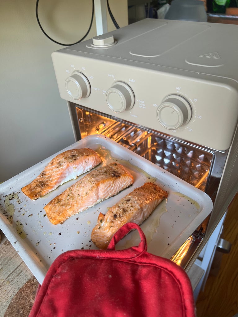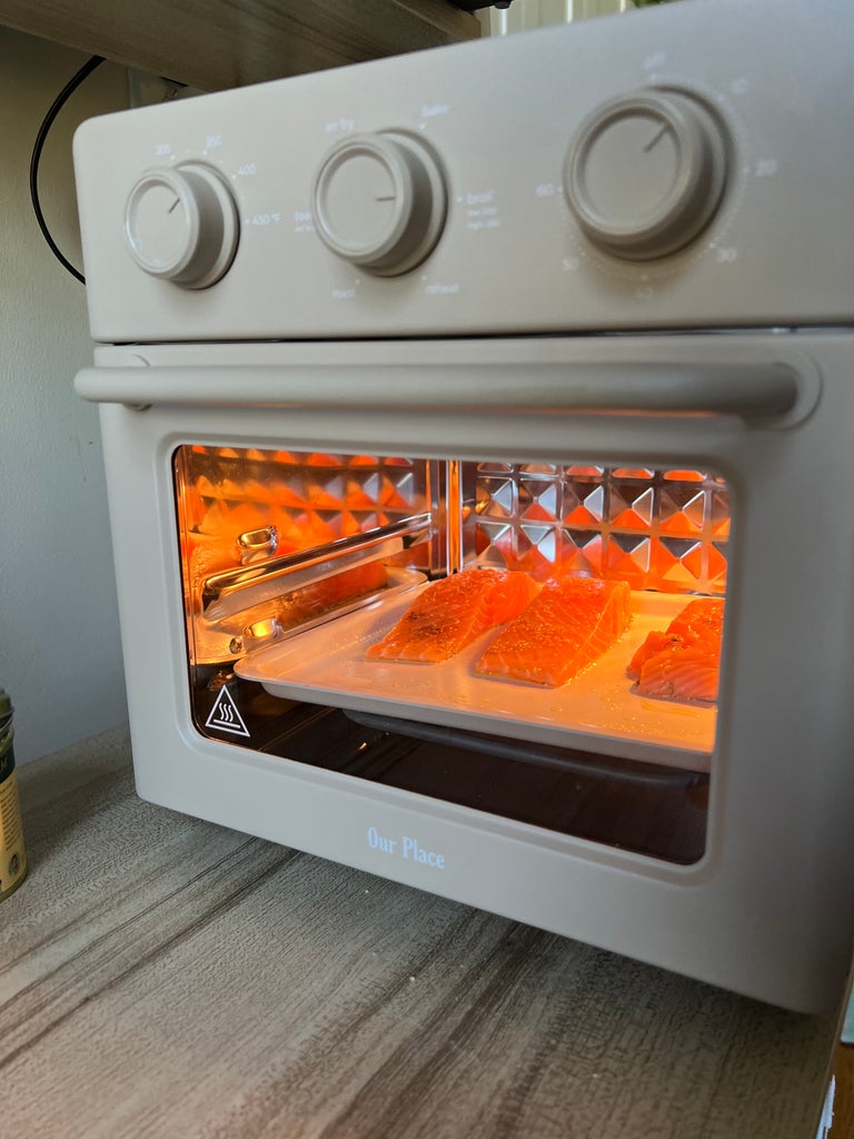 As a victim of my home oven’s uneven heat distribution as well as my unsatisfactory cooking skills, this beginner-friendly invention sounded too good to be true — albeit a dream. How can something so cute claim to crisp whole chickens, sizzle salmon fillets, bake bread, and more? So, I did what any lifestyle shopping writer would do. I reached out to Our Place, plugged in the Wonder Oven, and put it to the test the second I finished reading the manual. Read on to see how well this brave little toaster handled a full-fledged salmon dinner all from the comfort of my kitchenette’s countertop.