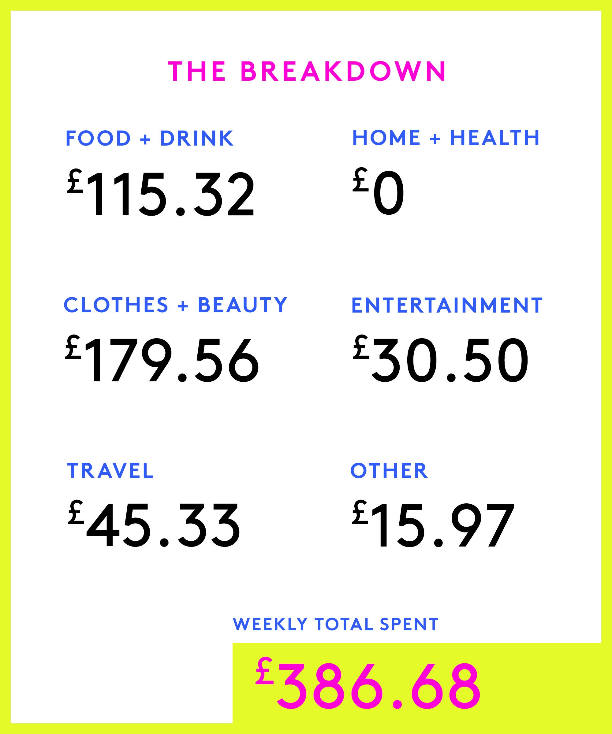 “It’s so interesting to see all my spending totalled up as quite often I worry that I am spending a lot, but on reflection I think this is relatively low (bar the late night Vinted trainers!). I do think my food spend is quite low this week. I tend to do a big shop every other week so in between will pick up bits and pieces, and this week was a ‘bits and pieces’ week. I do regularly meal plan and love a well-stocked freezer to make sure I can always cobble something together. The trainers were a treat and the Katherine Ryan tickets were a present to my future self. Particularly with the situation with my mum it’s become important for me to have things booked in to look forward to. In the future I should probably make more time for exercise and be careful to regularly reassess the time I have for myself, my mum, and other important relationships.”