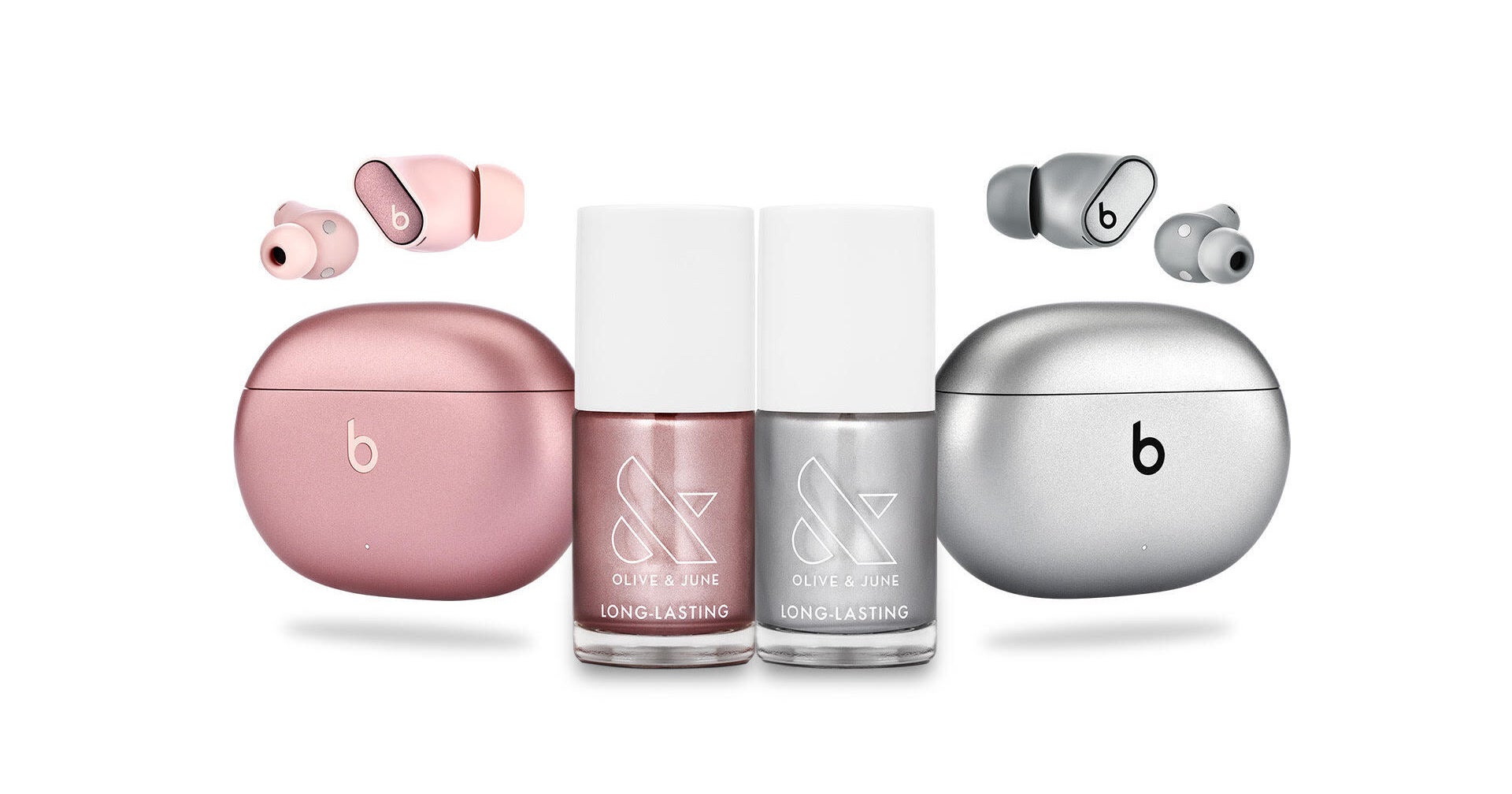 “As anyone who follows me knows, I’ve been wearing Beats forever. I’m so particular about what nail color I’m wearing, my phone case…all the things in your world,” Gibson Tuttle explains. “It really sets the mood when I sit in my airplane seat or if I’m taking a walk or whatever I’m doing I’m putting my Beats on.” As she tells me, the two polishes have been custom-formulated for an exact match to the earbud cases, and this was no easy feat. “The inspiration [for the collection] was the tech itself,” Gibson Tuttle explains. “Because of the unique composition of metallics, it was a uniquely exciting challenge to match colors across different materials: A piece of fabric to a nail polish, or in this case, a Beats case with polish.”
