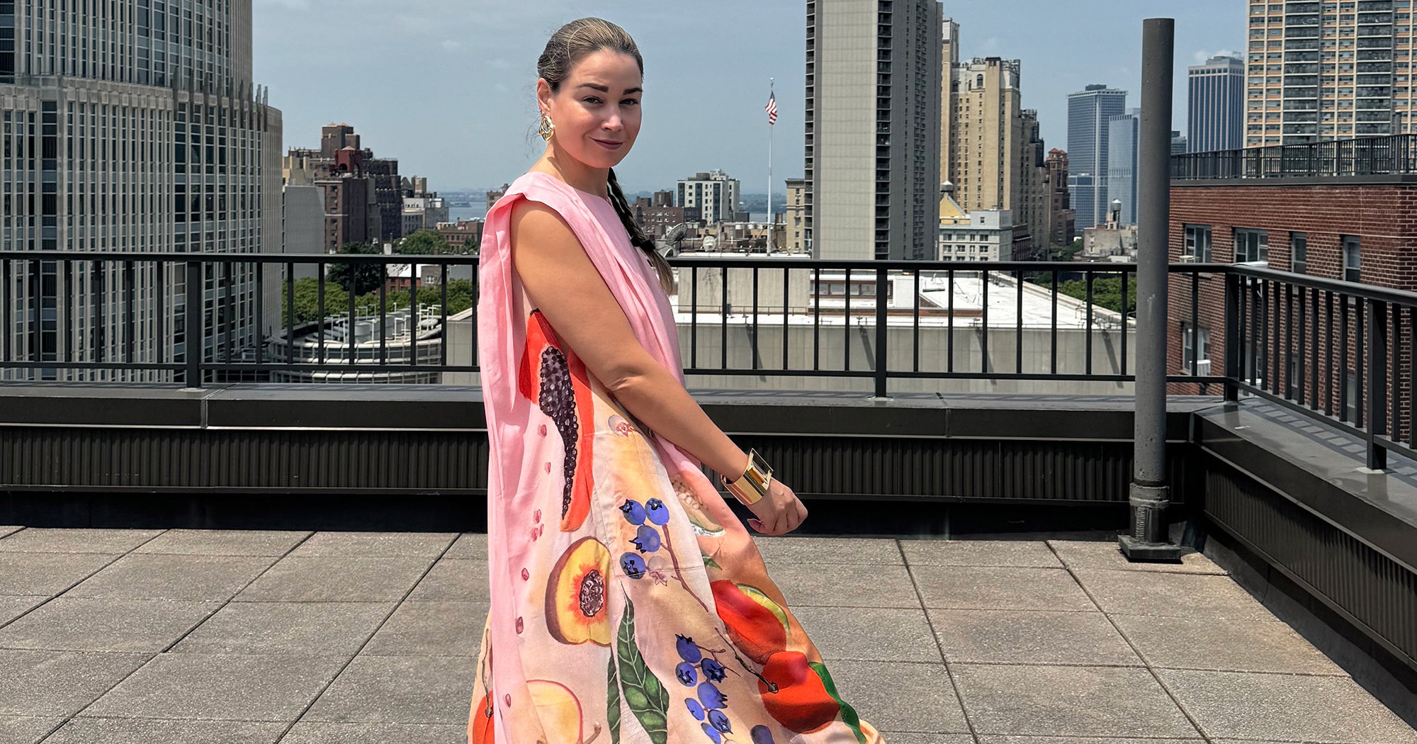 “While I adore Lance’s detailed paintings of fruits, flowers, swans, and sea creatures, the asymmetrical dress spoke truest to my personal style. The pastel color palette and whimsical print reminds me of aura photography, and the one-shoulder silhouette is a favorite of mine. I’ll admit, I was confused by the multiple side buttons running up the sleeveless side at first, but quickly figured it out, and appreciated that I could tighten the torso for the perfect fit.