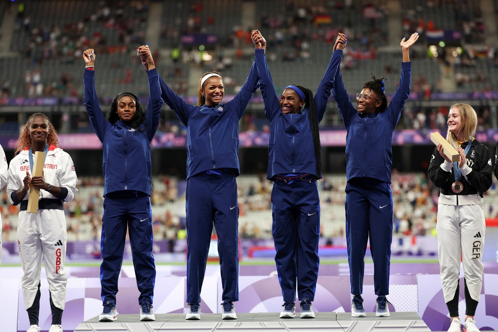 SR: Honestly, that look over, if I had to just highlight anything, the look over was — it’s almost like it was a mirror on that side of me, and I’m just looking at a version of myself that nobody but me could see, if that makes sense. I looked over and I just knew that no matter what was going on, there was nobody that I was going to allow — even myself — to be in front of me. I know that sounds crazy, but I was in that lane and feeling like I’m always my biggest competitor [so I had to] leave my best on the track. I was just like, there’s no way that I’m not going to leave my best on the track. And so just looking over, it was more so showing that the hard work that all of us ladies in that 4×1 put in was not going to be in vain. I wasn’t going to even allow myself to not cross that finish line in first place and not get that medal, or to let down those ladies and the support that we received when it comes to us crossing the finish line, in first place as Team USA.
