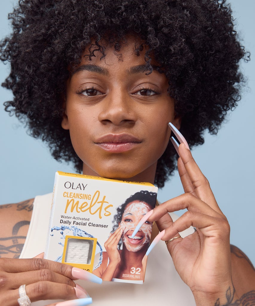 Sha’Carri Richardson: As a child growing up with my grandmother, [OLAY] was something that I’m already used to. In my house as a kid down in South Dallas, [OLAY] was almost like a treat, like Big Momma was like, “This is mine’s. Don’t touch my OLAY!” But honestly, even now, present day, going into the games, the ability to almost access that inner child in me and have this partnership with OLAY is amazing. I feel as if the product itself aligns with my lifestyle. Even while I’m outside, and I feel the build up of being outside, running in the wind, against the wind, hot, humid, cold, warm, whatever the case may be, when I use my OLAY Melts, that’s something that continues to let me feel content. I’m able to decompress. I’m going to take the energy that I know I invest into so many other things and invest back into myself and my self-care. I’ve been here for over 20 days now! [laughs]. If nothing else was consistent, my skincare routine with my Melts was consistent.