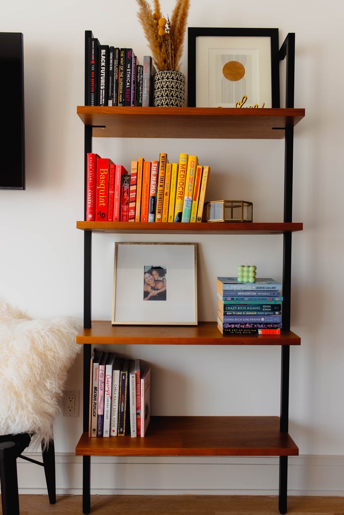 “While my overall color palette is pretty neutral, I do lean into lots of knick-knacks and decor to help add personality to the space,” Dae adds. Other accents, like plenty of exposed brick and a vanity fireplace, add to an industrial yet elevated vibe that is quintessentially Brooklyn. “My coffee table books explore the diaspora, so like, fashion, art, and interior design. And I really try to lean into artists who either center Black women, or that are Black women.”