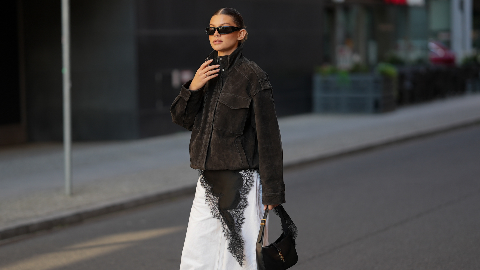 It was the perfect example of this particular top’s versatility. You can use it to soften leather, for example, slipping it under an aviator-style bomber. Or totally lean into the after-hours aesthetic with a matching skirt that’s similarly trimmed in lace. Because of its asymmetric hemline that dangles over one hip, you can also lend the merest of hint of lace to everyday outfits like jumpers and jeans (very The Row).